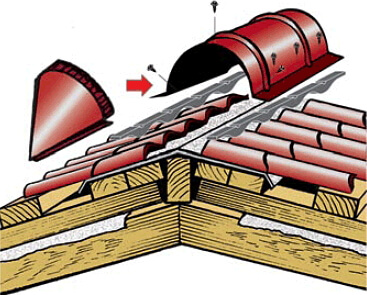 Коньковые планки бывают двух видов — круглые и плоские. При монтаже круглой коньковой планки используются саморезы или заклёпки, при помощи которых она крепится к торцу кровли или плоской заглушки. Саморезы вкручиваются через одну волну кровельного настила.