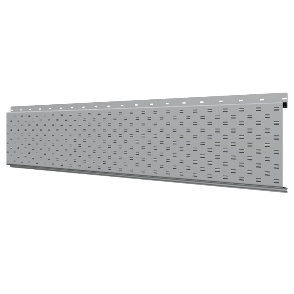 Линеарная потолочно-стеновая панель с ПЕРФОРАЦИЕЙ для вентиляции цвет RAL7004 Серый применяется в качестве софитов для подшивы крыши, наружной и внутренней отделки потолков, стен, фронтонов фасада дома в Якутске.