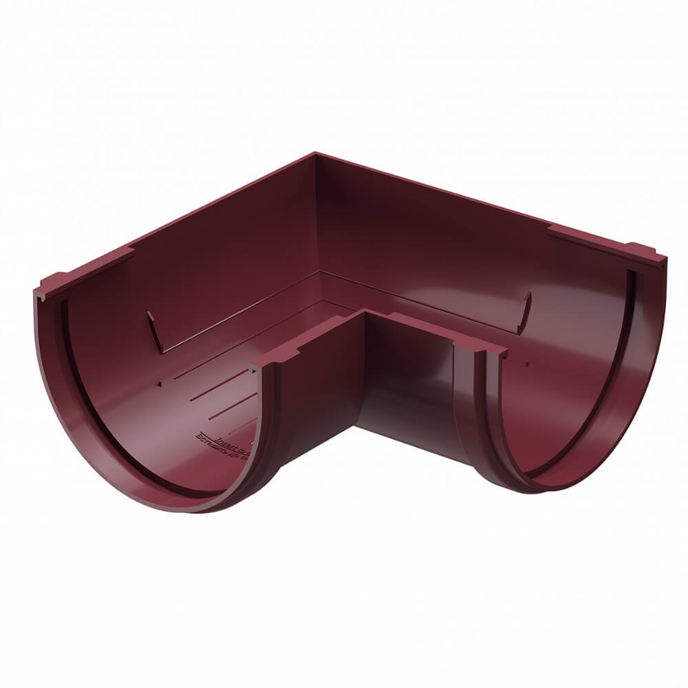 Угловой элемент желоба универсальный ДЕКЕ STANDARD d120мм 90 градусов цвет RAL 3005 Красный в Якутске. Угловые элементы устанавливаются как на внешних, так и на внутренних углах кровли и предназначены для соединения желобов.